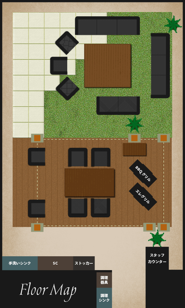 中央には重厚な木製テーブルを2台配し、周囲には17名様分のアウトドアチェアをご用意しました。